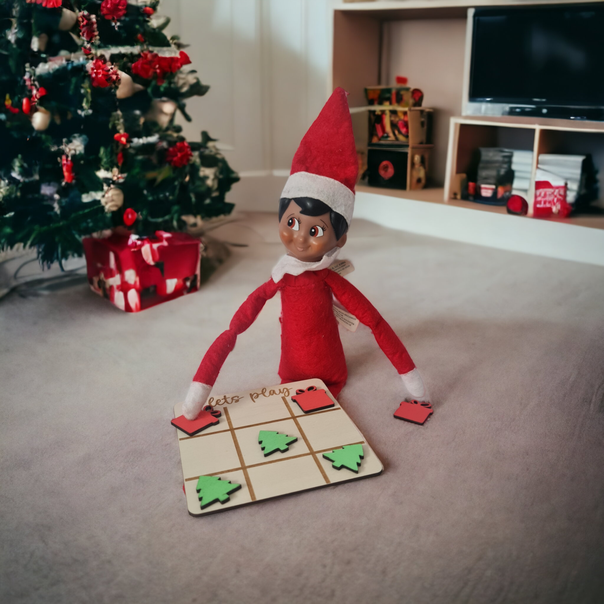 - If your kids are too young to play tic-tac-toe, you can still use the prop to have fun with your Elf. For example, you could have your Elf leave a note challenging your kids to find all of the trees or presents on the board.